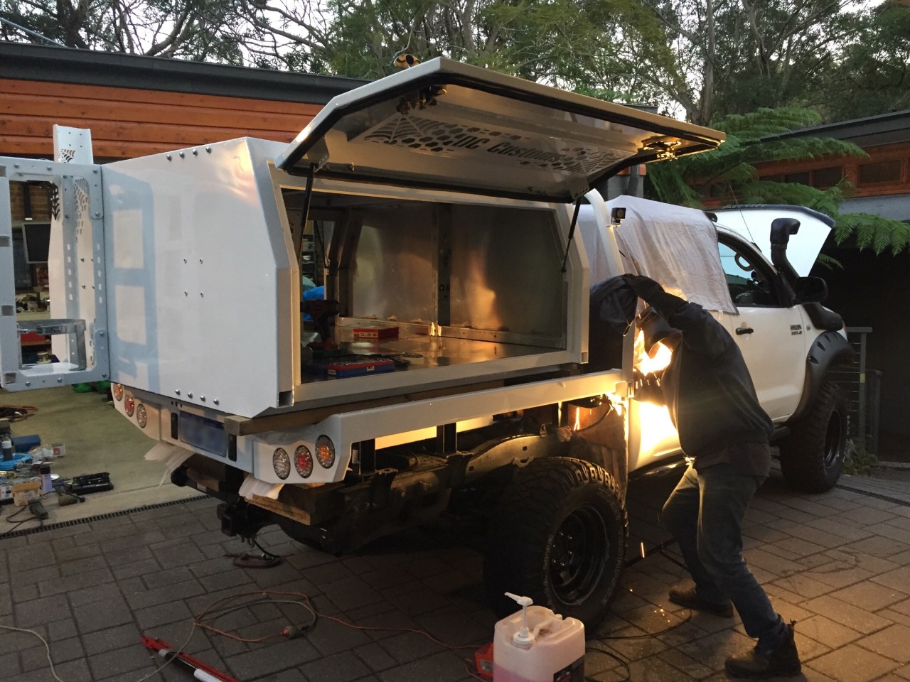 Our friend, Ivan at AluCab NSW, helped us immensely by lending us his workspace and forklift – the back of our ute was removed, and the new tray and canopy installed.