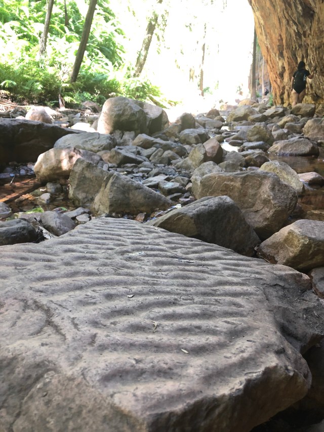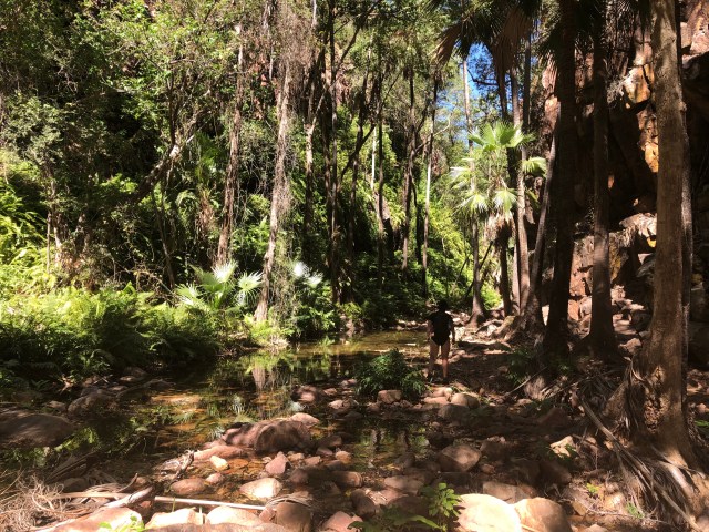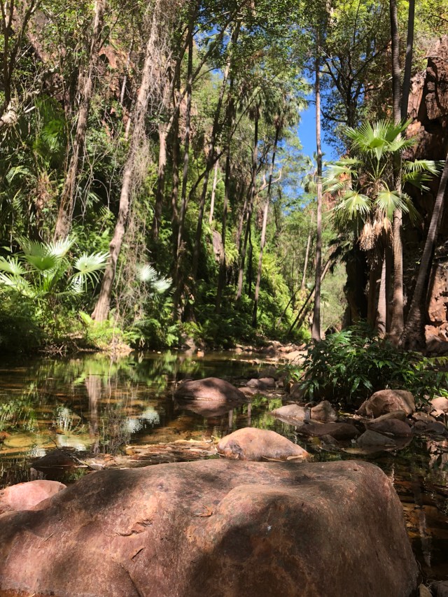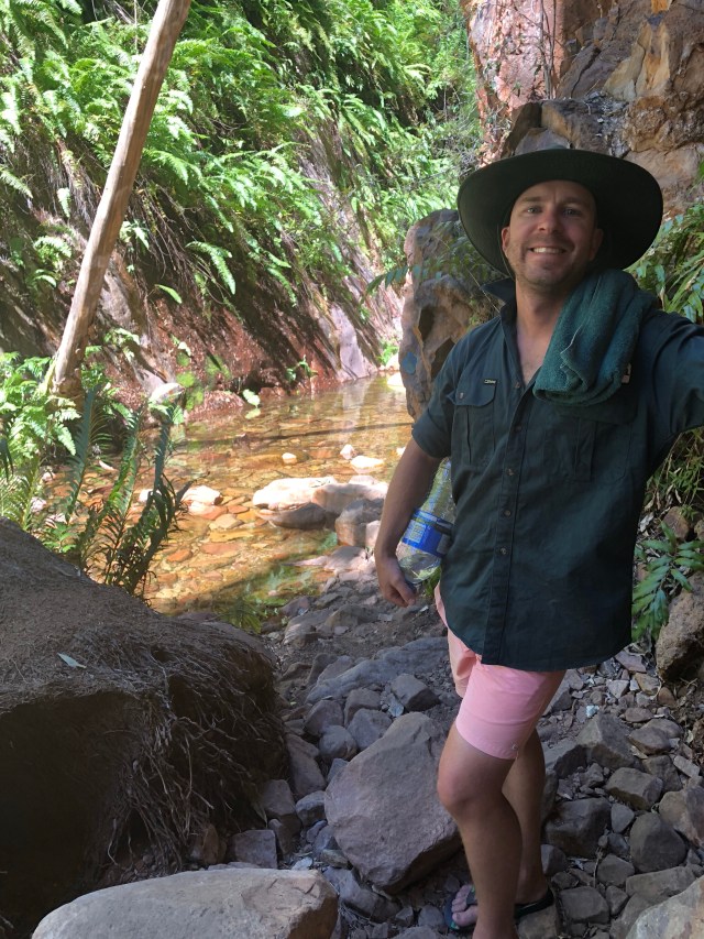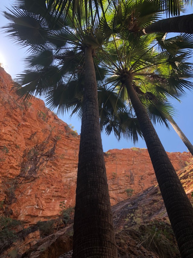 We made our way to the top and found the source of where the spring started. A tricky couple of sections, scrambling over slippery boulders and wet roots from the palm trees above, we found a small pool just big enough for the both of us. Too high and challenging for those grey nomads to conquer, we sat on our own in the soothing warm pool for well over an hour. Twelve o’clock struck and a Ranger came to tell us to get out. For whatever reason the springs shut at twelve o’clock every day, so we vacated and made our way back down the tropical oasis in the desert.