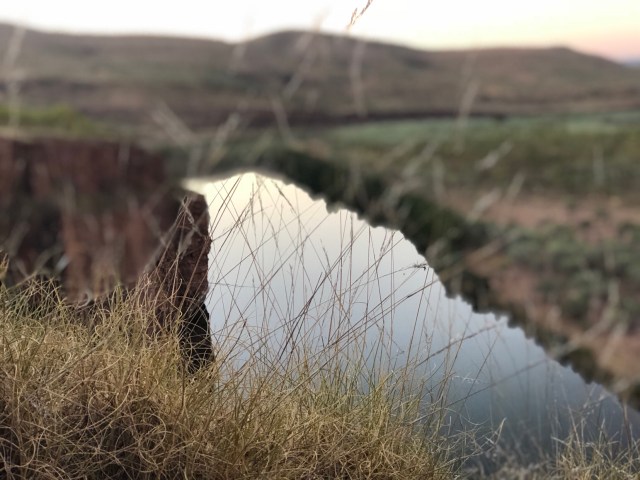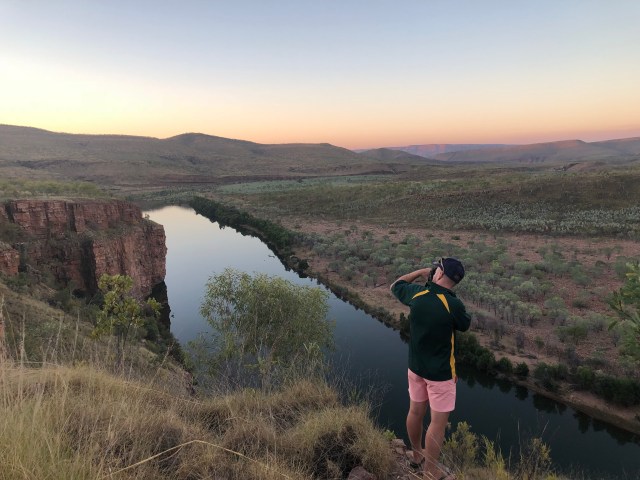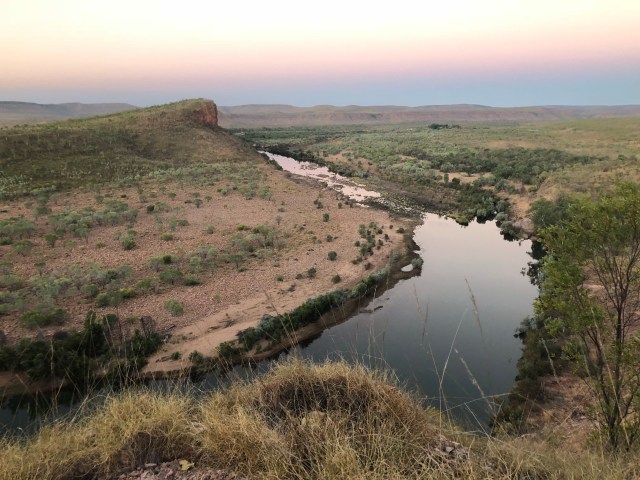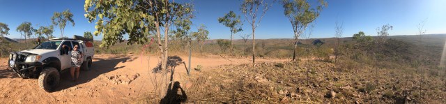 What is it with the maps with these places we come to? Caravan parks, gorge walks and station maps are terrible out here to say the least! Basic dirt maps. No scaling of any type. As an avid map lover, I find it easy and get my bearing well if I can see a true map. The map we had for EQ was un-bearably shit. Sorry for the French, but that is the most accurate definition for it. They had what seemed like two road maps, one on top of the other, but the second one was upside down! What it showed and where we actually went, were two different stories. The map marked ‘High lift vehicles only. Steep rocky accents. Recommended for experience four wheel drivers only’. “That’s us!”. We climbed up to the top. It wasn’t anything challenging whatsoever. I taught Cath how to scale way steeper and harder terrain before. We were both surprised. There were two look outs, the first taller than the second. But the second offered a viewing platform with seats and a table. We made our way to it and found level ground. Feeling a little peckish, we whipped out the burners and chucked a packet of snags and fried vegies in a pan. We sat and admired the 360 degree view over the station whilst filling our bellies. It was only half past four by the time we had the ute all packed up. Still with just under an hour till sunset we toyed with the idea of making it to another lookout. Another couple had made there way to the top by this point. We had a quick chat to them and they told us about Bronco’s lookout, which held a spectacular view over a sweeping river bend that held salties at the bottom. Well with that, we made our way back down and onto Bronco’s.