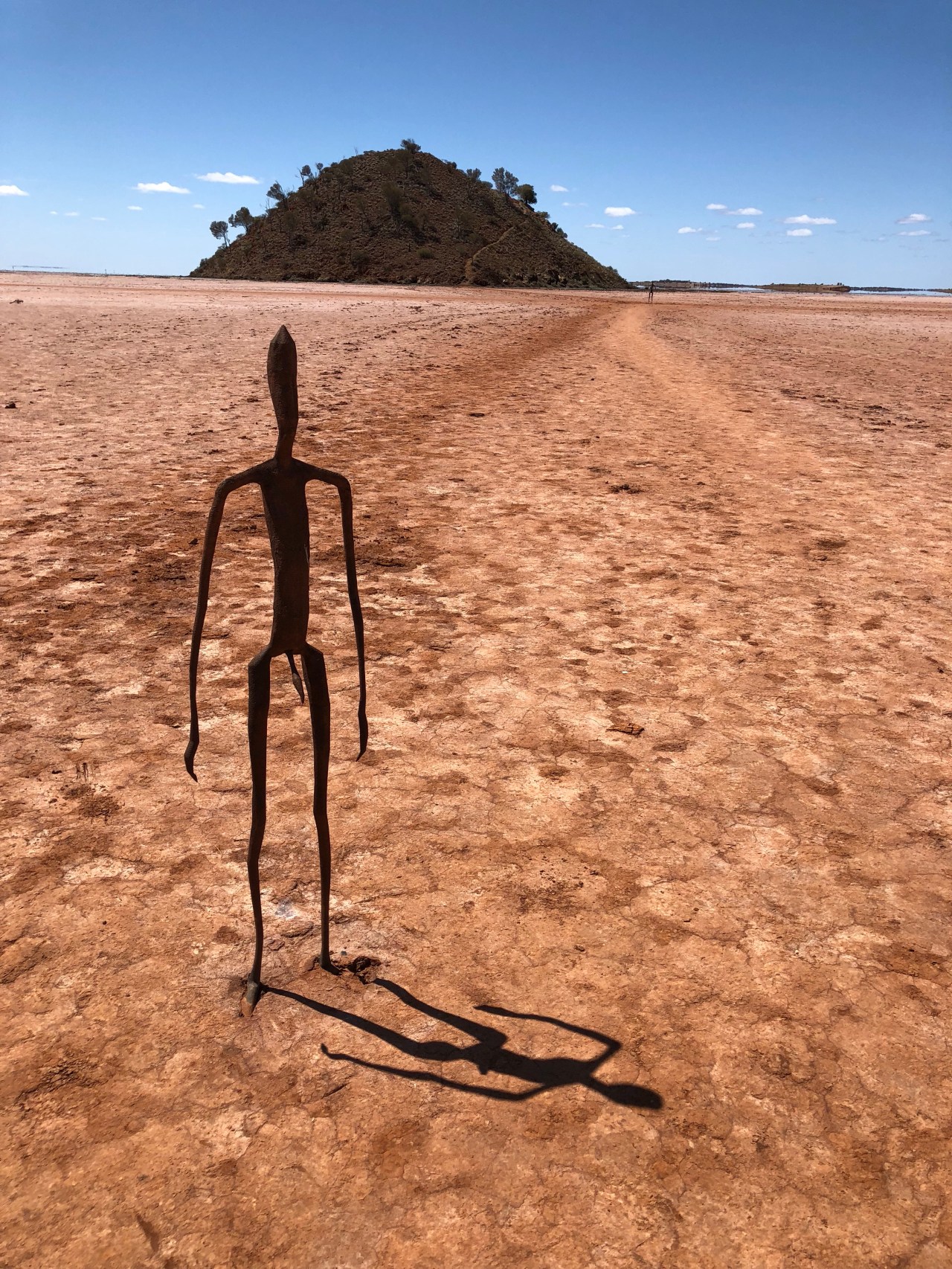 We arrived at Lake Ballard to have lunch. Johny and I had visited in our Kal-years twice before for the art installation across the salt lake. It still kept the same majestic feeling it always had. However this time tainted, with people writing their names all over the grounds. There is a large mound we hadn’t yet climbed before and today felt like a day to conquer. We hiked our way upwards over the loose gravel and felt bittersweet upon arrival to the top; the names sprawled out everywhere, engraved in the salt. The view was spectacular from here, as the mirage extended to beyond the horizon – however, again, were disappointed with the ‘graffiti’.