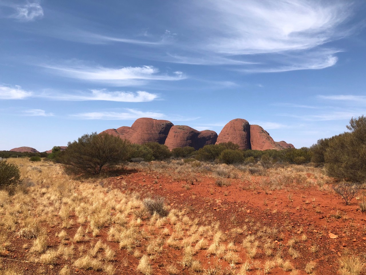 Further east, we finally drove past a large bushfire that had been the creator for most of the smoke haze in the air. The wind was still whipping across the country, yet visibility was back and we could see a fair bit further. As we came to the top of a hill, we were hit with the view of Kata-Tjuta.